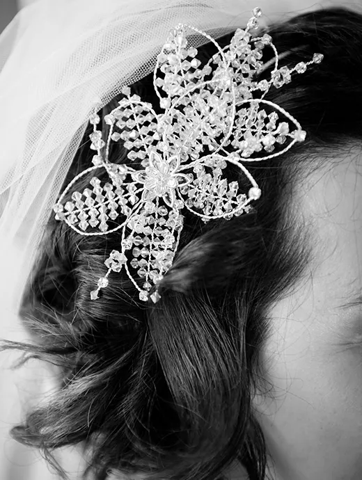 My wedding dress was a Sophia Tolli A-line, ivory satin dress that cost just over £1,100. As soon as I put the dress on I knew it was ‘the one’ – I felt beautiful! I wore a diamante flower side headband with a two tier, short veil which also had flowers appliquéd onto it – both matched the appliquéd flowers on the lace train and front detail of my dress.