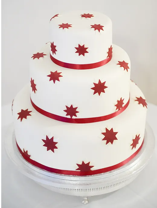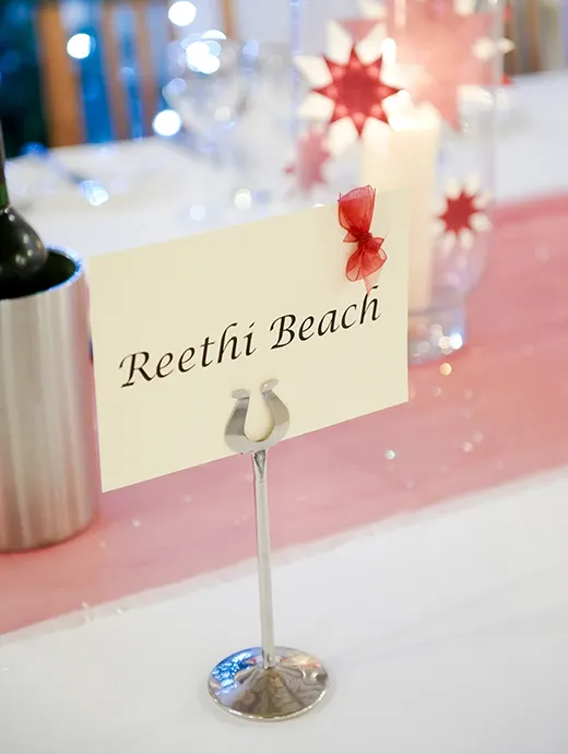 Our wedding theme was burgundy stars and our table names were of Maldivian islands, which was fitting as this was to be our honeymoon destination! We decorated with hurricane vases and church candles from Cherubs for the table centres and made origami hearts out of ivory and burgundy tissue paper that were placed around. Some of the guests also took home a star or two as a memento of our day.